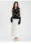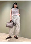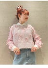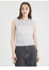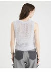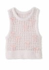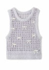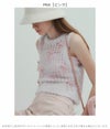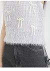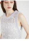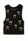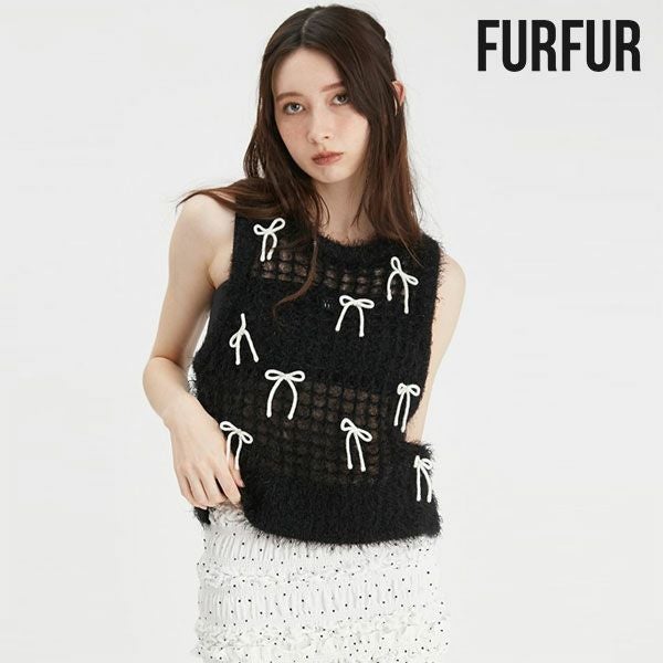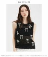 トレンドのリボンモチーフを配したニットベスト。 ボディはふわふわでシャイニーな風合いのメッシュ編みで、キャッチー&個性的なアイテム。 ブラトップなどと重ねてヘルシーに肌見せをしたり、シャツやシアープルオーバーとのレイヤードも素敵。