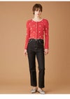 サテンのリボンで作った愛らしい小さなコサージュを散らしたカーディガン。 袖口に施したフリルは、中にテグスを通して立体感を出しバイカラーでトリミングしてこだわりました。 パール釦がアクセントに。