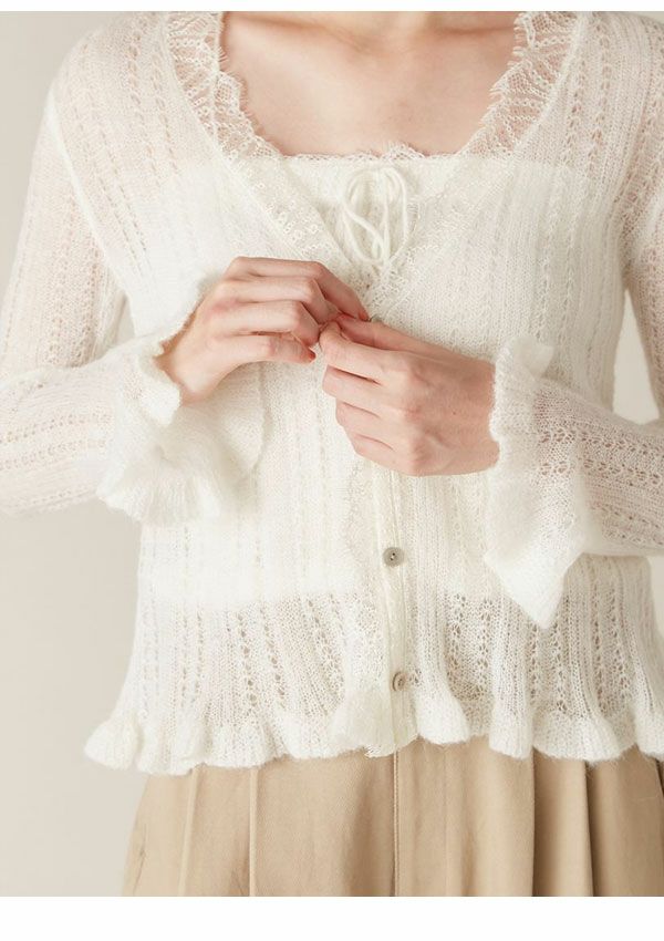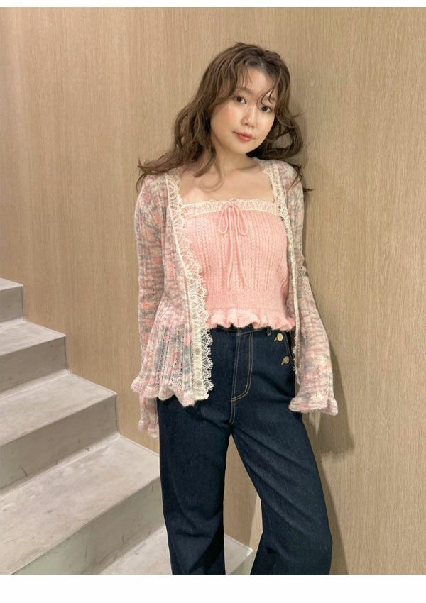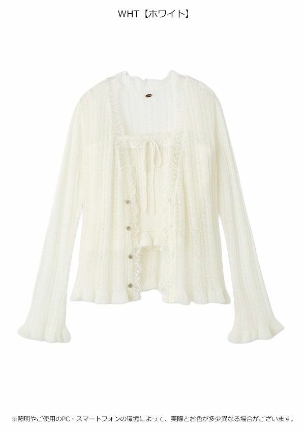 2025 Winter Collection 【新作10%OFF】【即納】 リリー ブラウン LILY BROWN トップス 25秋冬 レーストリムニットアンサンブル カーディガン キャミソール セット ミドル丈 長袖 透け感 lwnt261035