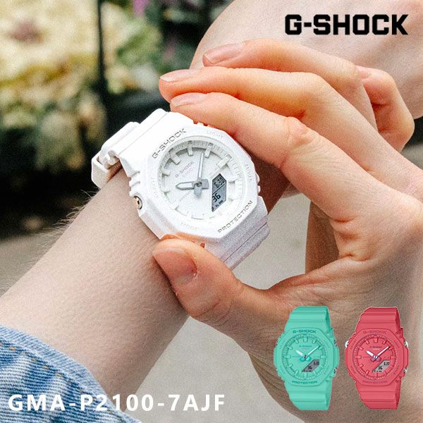 人気のデジタル・アナログコンビモデルGMA-S2100を更に小型化したGMA-P2100シリーズ。同時にバンドの長さも短くすることで、手首の細い方にもフィットするよう装着性を高めました。 文字板、ロゴ、インデックス、針などのパーツにトーンの異なる同色を配色することで、表情に変化のあるデザインに仕上げると同時に視認性を高めました。美錠とサイドボタンもステンレス素材を使用し、質感を高めています。GMA-S2100にあった9時側の小針をなくし、シンプルでミニマルな印象になるように仕上げました。ベゼル、バンドにはバイオマスプラスチックを採用。