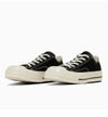スクエアトウのレザーシューズをモチーフにした新モデル、オールスター スクエアトウのカラーアレンジモデル。 ラインを一本にしたテープ等のディテールを採用することで、ミニマルにまとめたデザイン。 レザーシューズのような佇まいを意識しながらもスニーカーらしい履き心地のよさにもこだわった一足。 コットンのスペアシューレースが付属。 ALL STAR SQUARETOE SPEC ・スクエアトウのレザーシューズをイメージしたつま先の形状にこだわった新たなラスト ・つま先の印象に合わせた角ばった形状にアレンジした飾りのサイドステッチ ・レザーシューズのような外観をイメージしたトウキャップ、テープの艶出し加工 ・アッパーを成形する際の底面にクッション性に優れるPUシートを採用し、その上にクッション性、通気性に優れるオープンセルのウレタンフォームと反発性に優れへたりにくいスポンジラバーを組み合わせたインソールを搭載