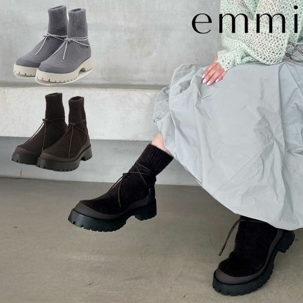 【emmiの大ヒットアイテムecoニットブーツシリーズ】 ■Design emmiオリジナルのアウトソールと、肌ざわりが魅力のフェザーヤーン糸を使用し、 足首まわりにドロストディテールを施してより立体的で旬な表情にアップデート。 伸縮性のあるニット素材は、着脱がしやすく、締め付け感のない快適なフィット感を実現。圧倒的な軽量性で長時間の着用もストレスフリー。 冬らしい素材感と洗練されたフォルムで、カジュアルからフェミニンまで、幅広いスタイリングにマッチします。