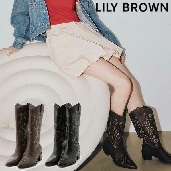 【足元からトレンドを取り入れるウエスタンブーツ】 「LILY BROWN」オリジナルの刺繍を施したウエスタンブーツが登場。 やや幅広の筒幅に、トレンド感のあるカッティングを中心に加えた洗練されたシルエットが魅力です。 刺繍には流れるようなハートモチーフを取り入れ、配色ステッチで遊び心たっぷりのデザインに仕上げました。 昨年から注目され続けているウエスタントレンドの中でも、ブーツは取り入れやすく、様々なスタイリングで活躍する万能アイテムです。 スラックスやふんわりとしたワンピースとの相性はもちろん、今季はデニムやミニスカート、 膝丈ショートパンツと合わせてトレンド感のあるコーディネートを楽しむのもおすすめです。 ブラウンとブラックの2色展開でお届けします。