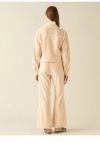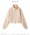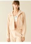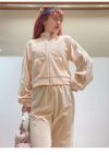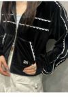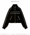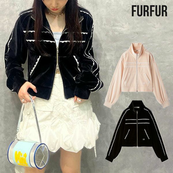 袖にスカラップレースとパイピングテープでラインを入れて、スポーティなエッセンスを落とし込んだトラックジャケット。 毛足が短いマットなベロアを使用してナチュラルな高級感を演出。 逆開ファスナーを使用しているので、ファスナーを半開にしてインナーを見せるコーディネートも今年らしくお勧め。