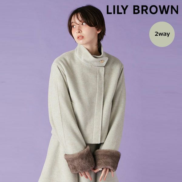 【モードな印象に進化した袖ファー2WAYコート】 昨年も好評だった袖ファー付きの2WAYコートが、よりモードな印象にアップデートして登場。 丸みのある大人っぽいコクーンシルエットはそのままに、 衿元はスタンドカラーに変更し、洗練された表情に仕上げました。 袖のファーは取り外し可能で、気分やシーンに合わせて着こなしの幅を広げられます。 同素材のミニスカート(LWFS255126)とのセットコーデもおすすめ。
