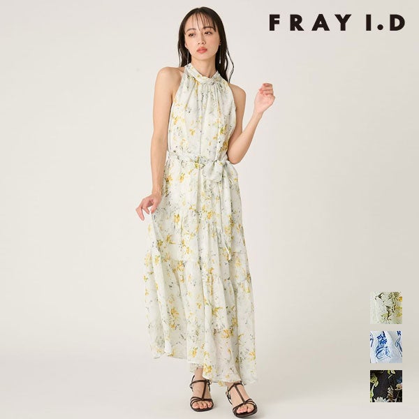 【オリジナルプリントが映えるホルターネックワンピースが今年も登場】 FRAY I.Dで人気のホルターネックワンピースがアップデートして再登場。 今季は、ティアード切り替えを2段にしてボリューム感をプラス。 たっぷりのギャザーとややアシンメトリーなラインがドラマティックなシルエットを叶えます。 セットのリボンはウエストマークだけでなく、バックネック・サイドネックで結ぶことも可能。 シーンに合わせてさまざまなスタイルが楽しめます。 軽やかなシアー素材や、バックシャンな肌見せデザインも素敵に映えるポイント。 色展開は全3色で、全てFRAY I.Dオリジナルの華やかなプリントを施しました。 YELは水彩と線画のミックスが繊細で優美に、BLUは大人なチューリップ柄、BLKは大胆に描かれたボタニカル柄で、どれも目を引く存在感を発揮してくれます。