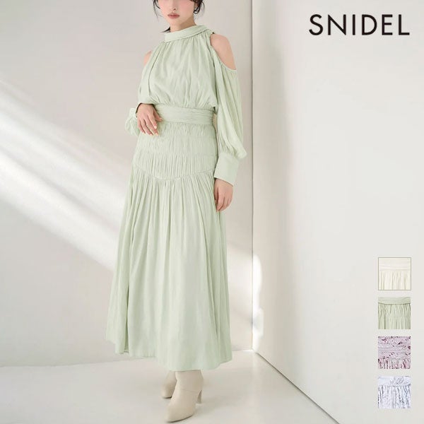 【軽やかで優美な動きを生み出す、人気のコールドショルダーロングワンピース】 たっぷり柔らかなギャザーが生み出すふんわり感と、 カットスリーブで肩先に抜け感を出したシルエットで軽やかな魅力を加えたコールドショルダーロングワンピースが届きました。 柔らかなドレープのややハイネックデザインで後ろ側にはロングテールリボンを配置しバックシャンに。 袖口はカフスできちんと感を出し、エレガントに仕上げました。 割繊生地のソフト感を活かしたシルエットですが、後ろのウエストマーク位置にはゴムシャーリングを加えてシルエットにメリハリを出し、 ヒップ位置にかけては細やかなプリーツですっきりとさせ、スタイルアップ効果も期待できます。 ゆるっと羽織れるニットボレロカーデ(SWNT261055)とコーディネート色でお作りしており、セットでのご着用がおすすめです。後ろファスナーで着脱いただけます。
