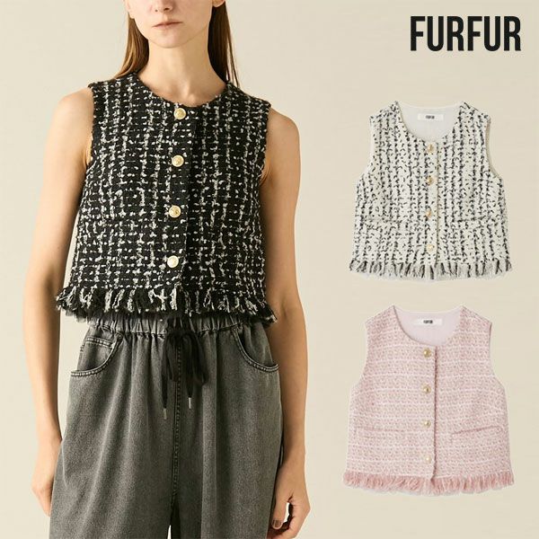 【SALE20%OFF】【即納】 ファーファー FURFUR トップス 25秋冬 ツイードベスト ベスト ミドル丈 ノースリーブ rwfs254051 rwft254075