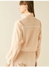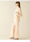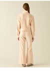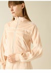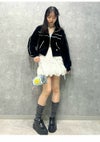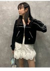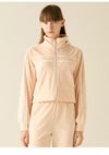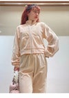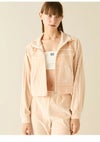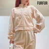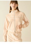 袖にスカラップレースとパイピングテープでラインを入れて、スポーティなエッセンスを落とし込んだトラックジャケット。 毛足が短いマットなベロアを使用してナチュラルな高級感を演出。 逆開ファスナーを使用しているので、ファスナーを半開にしてインナーを見せるコーディネートも今年らしくお勧め。