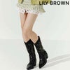 【足元からトレンドを取り入れるウエスタンブーツ】 「LILY BROWN」オリジナルの刺繍を施したウエスタンブーツが登場。 やや幅広の筒幅に、トレンド感のあるカッティングを中心に加えた洗練されたシルエットが魅力です。 刺繍には流れるようなハートモチーフを取り入れ、配色ステッチで遊び心たっぷりのデザインに仕上げました。 昨年から注目され続けているウエスタントレンドの中でも、ブーツは取り入れやすく、様々なスタイリングで活躍する万能アイテムです。 スラックスやふんわりとしたワンピースとの相性はもちろん、今季はデニムやミニスカート、 膝丈ショートパンツと合わせてトレンド感のあるコーディネートを楽しむのもおすすめです。 ブラウンとブラックの2色展開でお届けします。